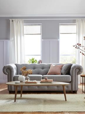 Tufted detailing on the grey sofa is carried through to the armchair, which is a creamy vanilla, so it it picks up on the light grey walls and the subtly patterned rug.